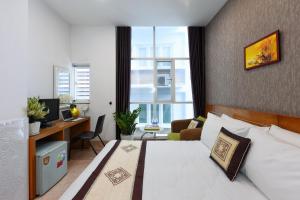 Phòng sạch sẽ, vị trí thuận lợi, view phòng mình ở nhìn ra được toà Bitexco. Cửa sổ kín, bên ngoài ồn đóng cửa sỗ sẽ k nghe thấy gì. Nhược điểm là có tiếng động ngoài hành lang trong phòng sẽ nghe thấy rõ, tuy nhiên không ảnh hưởng lắm. Quạt cách xa giường, m nằm phải mở đh nên sáng dậy mũi sẽ bị khó chịu. Nv nhiệt tình.